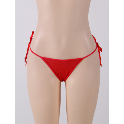 Wrap your curves in a pretty red string. Complete your lingerie collection with this flirtatiously feminine G-string. Above your bottom, an embroidered flower design draws attention to your curves. The low -rise tiny waist band decorated with flirty bow with metal ring. The front of the sting is made out of soft, translucent mesh material.