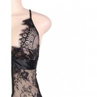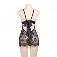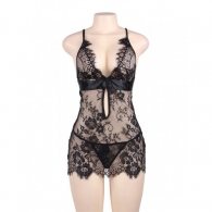 Translucent eyelash lace elegant chemise for hot bedroom moments. Black floral lace babydoll with matching string.