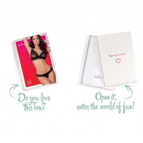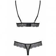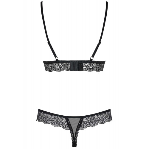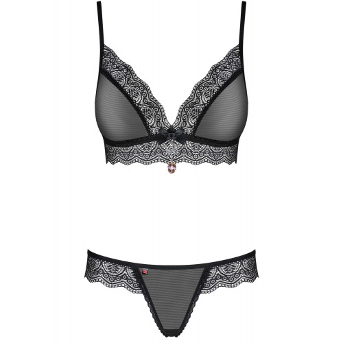 Translucent mesh lingerie set from Obsessive Lingerie line. Black soft mesh with tempting lace details. Beautiful lingerie set adorned with charming beige jewel on the bra.