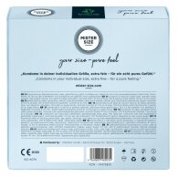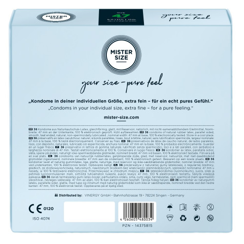 Transparent, extremely thin Mister Size condoms (47 mm) made out of natural rubber latex. The condoms are covered in lubricant and are teat-ended. Vegan.