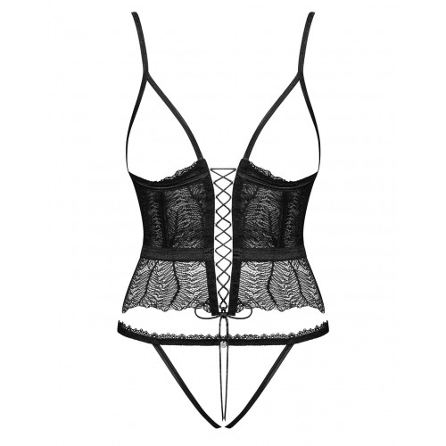 Το απόλυτο καυτό λουκ! Μαύρος κορσές με ιδιαίτερα μαλακή και άνετη δαντέλα, ο οποίος αναδυκνύει το στήθος, με ασορτί στρινγκάκι με ανοιχτό κάβαλο για.. εύκολη πρόσβαση.