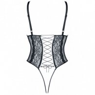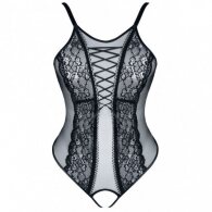 Crotchless soft mesh teddy lingerie with delicate lace inserts in the front. Elaborate lace is combined with black mesh to form an interesting, elongated composition in the front, so the bodysuit optically slims the body. Lacing with black ribbon beautifully adorns the neckline.