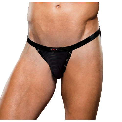 The front of this Envy Menswear thong hardly gives a clue to the frisky design details at the back! Designed in black mesh and nylon, the front features smooth lines and thin band low across the hips,while the back features a lace-up element, tying the thong together.