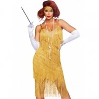 2 Piece Dazzling Daisy, includes gold shimmer fringed dress with applique accent and matching headband.