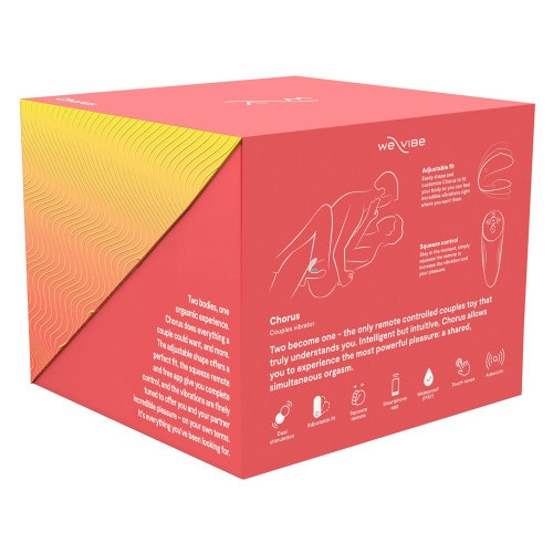 C-shaped couple's vibrator Chorus from We-Vibe that features 10 and more vibration modes. It is flexible and stays in position to adapt to the individual shape of the body. The new AnkorLink™ technology creates a connection to the remote control, which then connects to the couple's vibrator and works as a signal amplifier to make a better connection to the app possible. It is a brand-new technology that works more steadily and reliably than Bluetooth and makes sure that smartphone and sex toy are always connected. The remote control itself also has Squeeze Control to adjust the intensity of the vibrations by squeezing it. Chorus also features special receptors so that in Touch-sense mode it can be controlled by simply laying on the hand. The app lets the users control the toy remotely over large distances and they can also create custom vibration modes. The vibrations can also be synchronised to music. The Chorus comes in a discreet storage box that is also a charging station for the remote control and vibrator. Fun is possible anywhere with Chorus because it is waterproof. Includes a USB cable for the magnetic charger box.