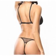 The delicate black mesh bra with flower lace insert and eye-catching V-shaped detail in the middle of the neckline draw the attention to the breast.