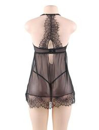 Sexy Black Sheer Floral Eyelash Trim Lace Babydoll Set (ST-R80636-1*)