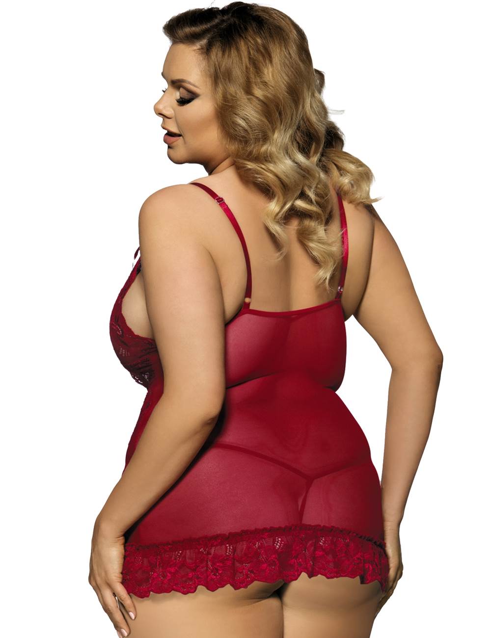 Red Deep V Neck Lace Sexy Slim Sleepwear With Thong (ST-R70218-3P*)