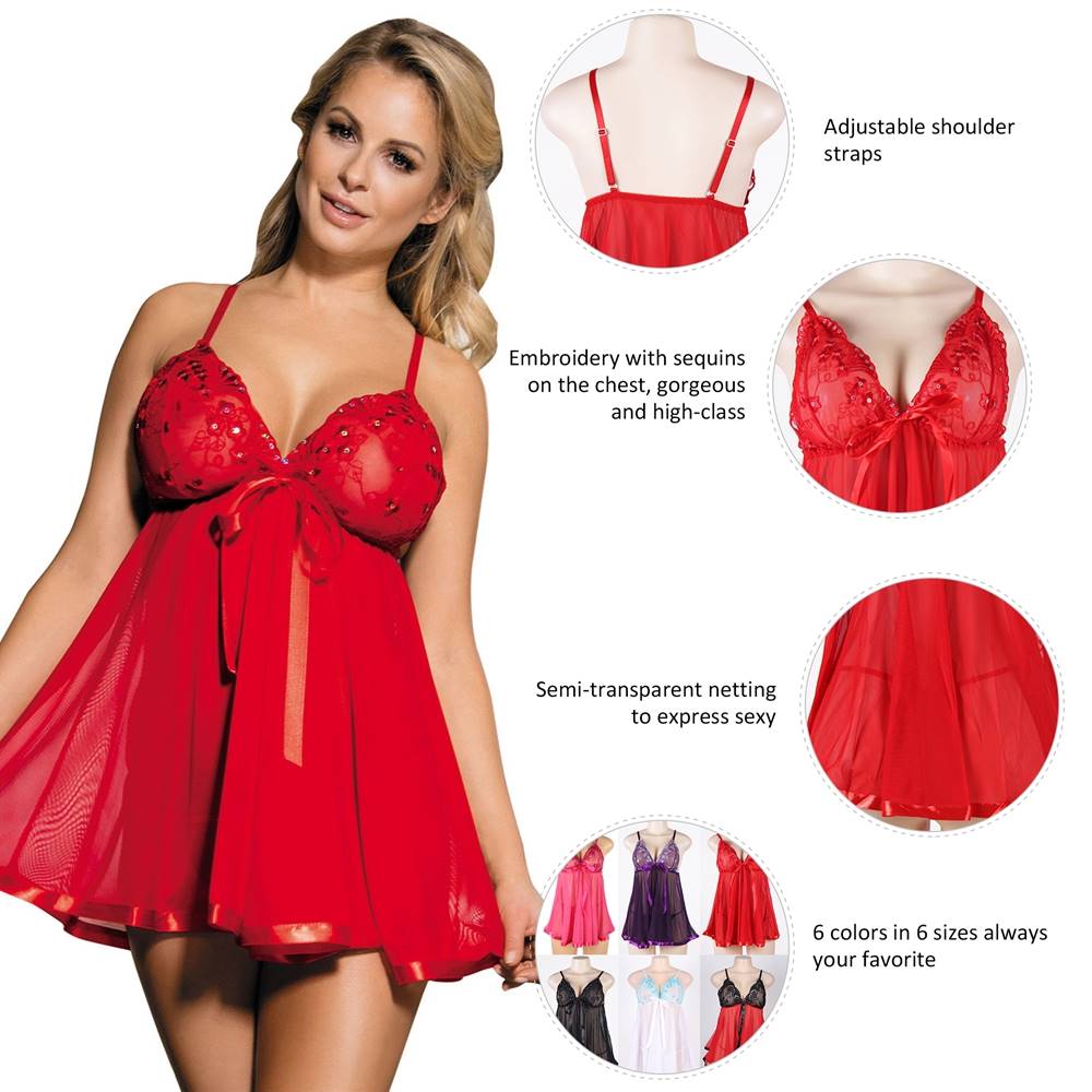 Babydoll σε κόκκινη απόχρωση που συνδυάζεται με ασορτί g στρινγκ και με διαφάνεια. Έχει ρυθμιζόμενες τιράντες για να πετύχετε άριστη εφαρμογή. Στο στήθος έχει διαφάνεια με δαντελένια στοιχεία και διακοσμείται με στρας και στην μέση με ένα φιόγκο. Η δαντέλα έχει λουλουδένιο μοτίβο.