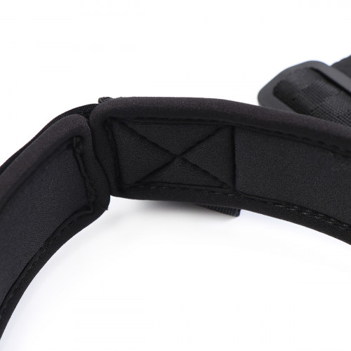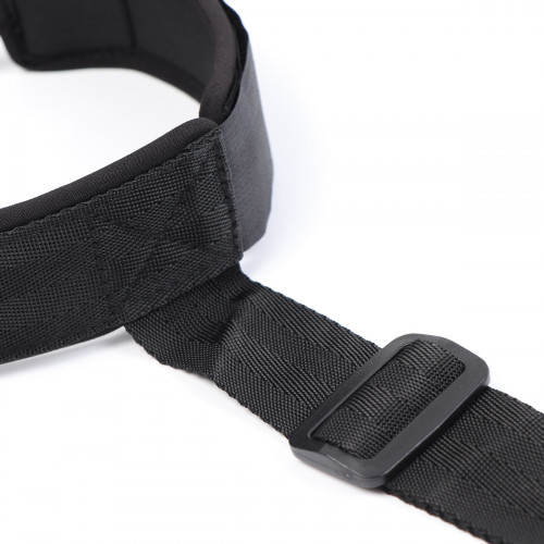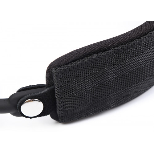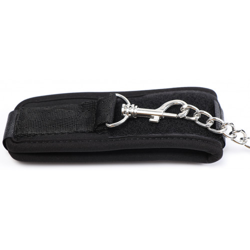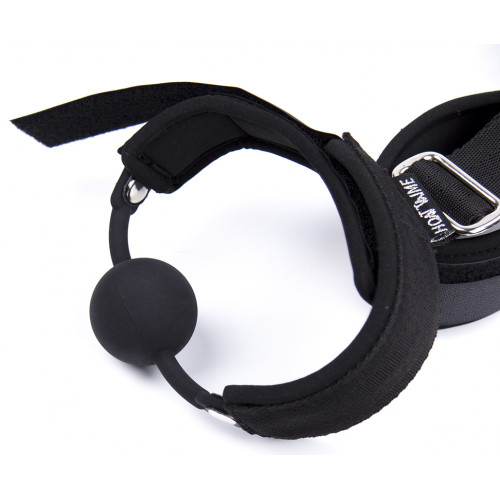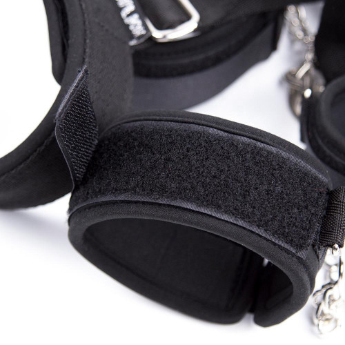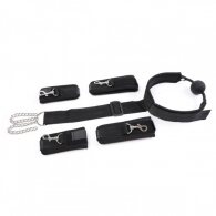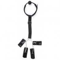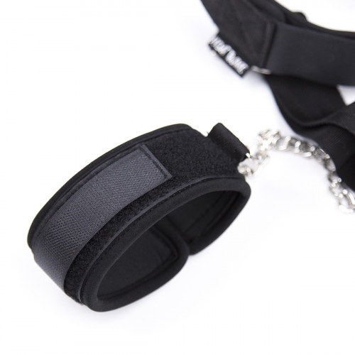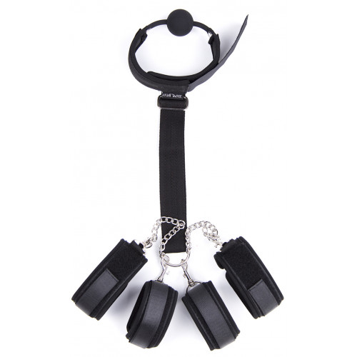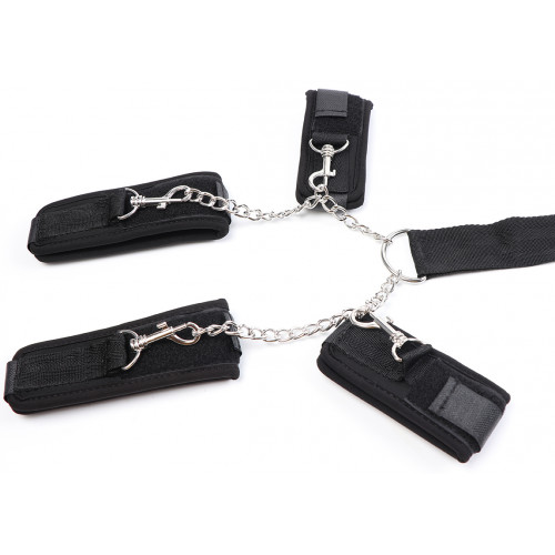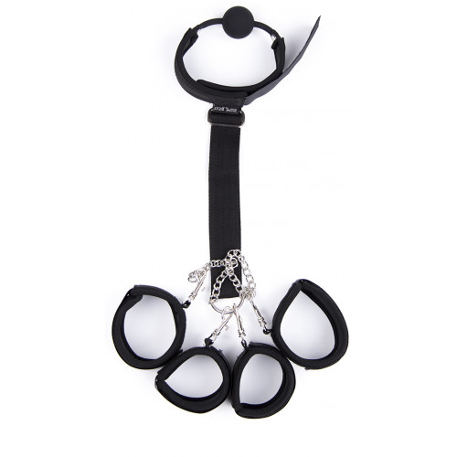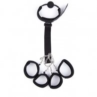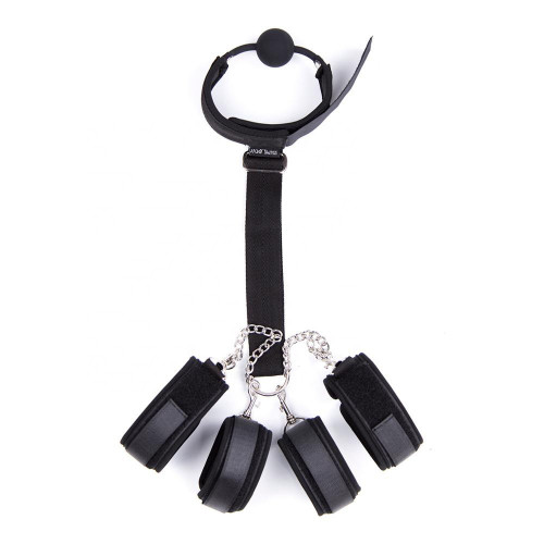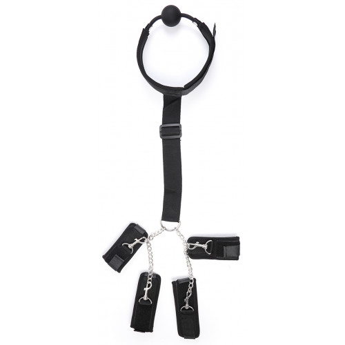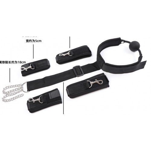 Naughty Toys adjustable four backhand arm and wrists restraint cuffs with neck collar and a mouth gag. Perhaps the most one-piece complete bondage restraint system ever. This restraint Bondage system is a combination of (4) four Backhand, arms and wrists cuffs (see photos) combined with neck collar and a silicone mouth gag. Collar, wrists and ankle cuffs are made with nylon velcro and they can instantly adjusted. Cuffs are connected with metal snap hooks and chains
