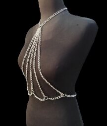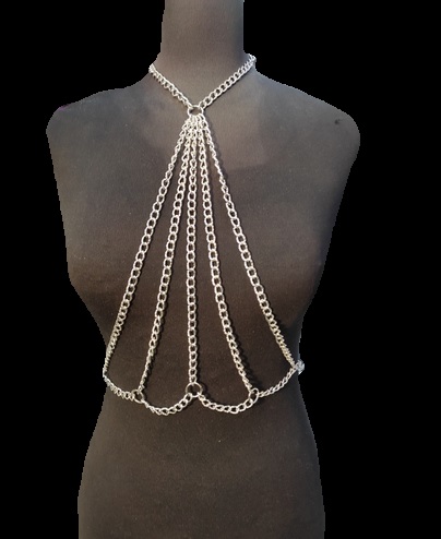 Χειροποιητο σύνολο απο αλυσίδες αλουμινίου ελαφριές, αρίστης ποιότητος. Από το λαιμό ξεκινούν 5 κάθετες αλυσίδες με ανοιχτή κατάληξη στη μέση. Ενα κόσμημα στο κορμί σας αφου οι αλυσίδες λαμπιρίζουν και τραβάνε τη ματιά του συντρόφου σας. Απο το λαιμό ξεκινούν 5 αλυσίδες και καταλήγουν ανοιχτά στη μέση. Μπορείτε να το φορέσετε και με ρούχα σερ ανάλογο ντύσιμο σε μία ιδιαίτερη έξοδό σας.