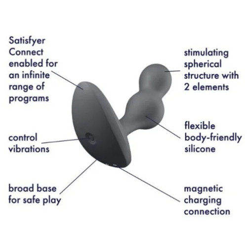 Μικρή προς μέτρια πρωκτική σφήνα (μέγιστη διάμετρος στα Ø 3,3 εκ) με λειτουργία δόνησης και εφαρμογή έλεγχος απο το κινητό σας τηλεφωνο. ΠροιΌν της Γερμανικής εταιρείας Satisfyer, σε γκρι προς μαύρο χρώμα και η οποία εισάγεται στο ορθό, διεγείροντας και ταυτόχρονα προετοιμάζοντας την περιοχή του πρωκτού, για οσο πιο άνετη διείσδυση από πέος ή από πιο χονδρό πρωκτικό δονητή. Σχεδιαστικά κατασκευασμένη για να αποτρέπει περαιτέρω εισόδο στο ορθό, το οποίο αποκτά σταδιακά την απαιτούμενη ελαστικότητα με αποτέλεσμα τη μείωση του πόνου και την αύξηση της απόλαυσης κατά τη διείσδυση. Εργονομική σχεδίαση για άνετη και πολύωρη χρήση.