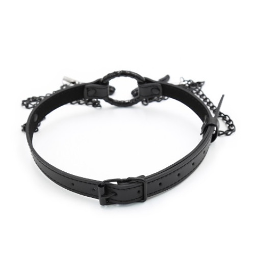 Naughty Toys metal O-Ring Ø 3.5 cm with adjustable nipple clamps. High quality metallic mouth Gag for submissive Bondage games for him and for her! Bondage toy for those bedroom moments when wide-open isn't wide enough, then, Naughty Toys mouth Gag will get the job done! This extreme gag consists of a steel ring with chainned adjustable nipple clamps attached to the mouth gag strap. The gag prevent the mouth from closing, leaving your subject's mouth wide open for whatever you wish to put in it.