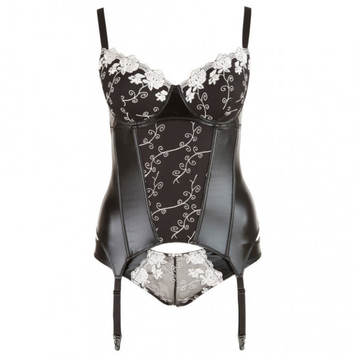 Plus size black wetlook basque with white floral embroidery down the front and on the slightly padded underwired cups.