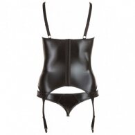 With a hook fastener at the back. The bra and 4 suspender straps are adjustable. Includes a matching G-string with wetlook at the back.