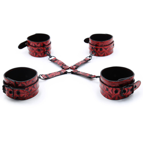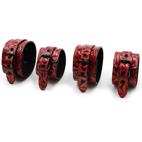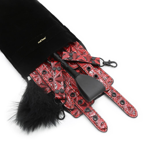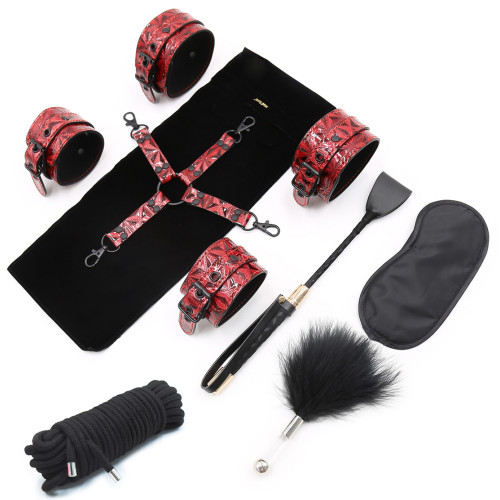 Ideal for begginers and intermediate fetish lovers. Explore any fetish fantasy with Naughty Toys Scandalous Bondage 7 piece set. Where quality meets your fantasies and pleasures. Explore any bondage fantasy you have in mind with our very own thrill black-Red Faux Leather 7 Piece Bondage Kit by NAUGHTY TOYS. This complete kit offers everything you need to act out your kinky desires. With an included blindfold, Horse whip, hogtie restraint, wrist cuffs, ankle cuffs, 10 meters cotton rope, Feather Tickler there are plenty of new and exciting sensations to be explored. It's perfect for any experience level, from bondage beginners to BDSM experts alike!