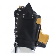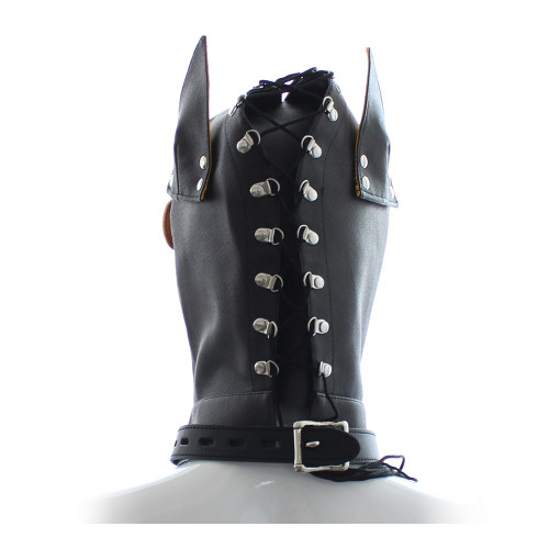 The hood closes in the back with corset-style lacing and buckles at the neck with the collar. The collar also features a D-ring (for attaching a leash) - The leash shown in photos is NOT INCLUDED . The blindfold uses snaps so that it can be easily removed.
