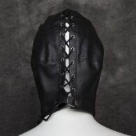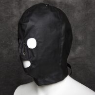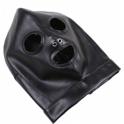 High quality full head cover, leather Hood mask with mouth, eyes openings by Naughty Toys. Unisex, one size with perfect fit. Made of high quality faux leather. Super sexy black mask with eyes and mouth openings. The back of the mask has got thin elastic bands that tie up the hood to your head.