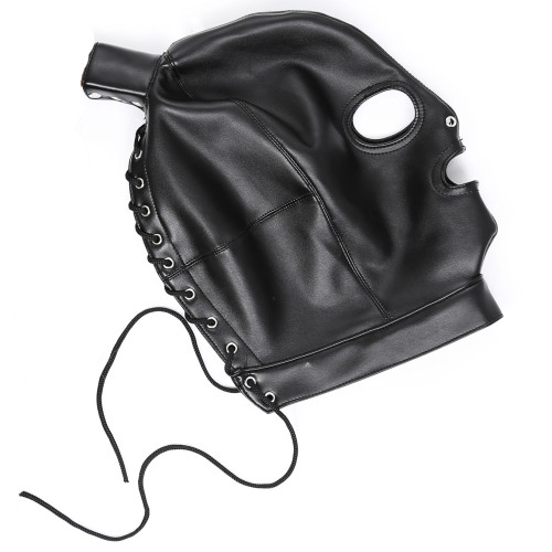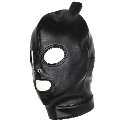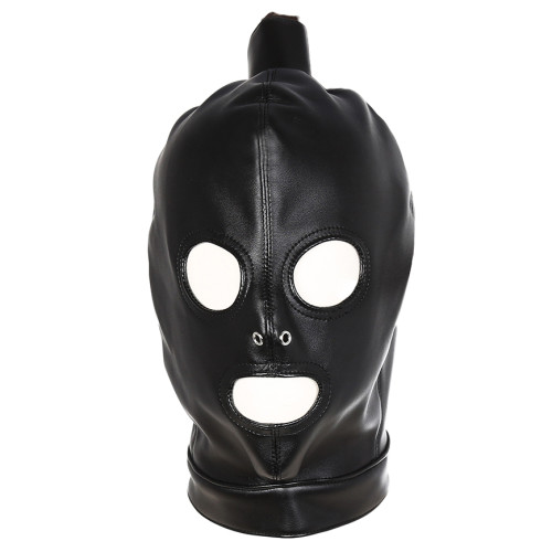 Bdsm leather Hood with mouth, eyes and ponytail opening by Naughty Toys. Unisex, one size with perfect fit. Made of high quality faux leather. Super sexy black mask with eyes and mouth openings and with a hole for your ponytail. The back of the mask has got thin elastic bands that tie up to your head.