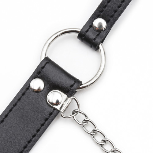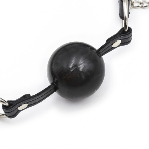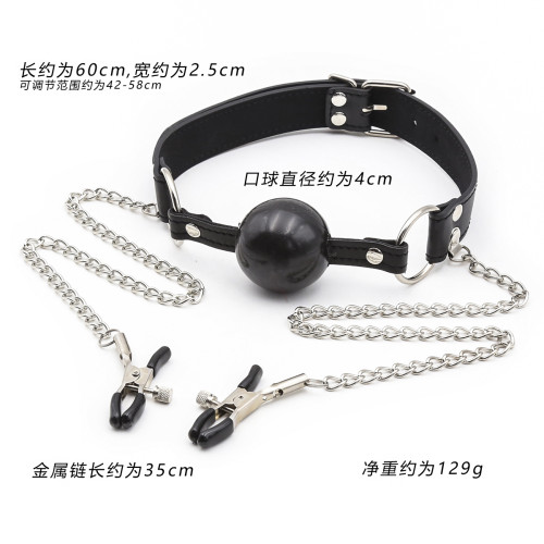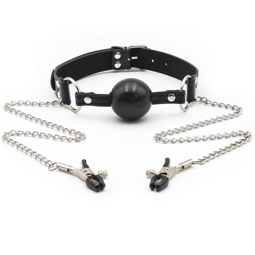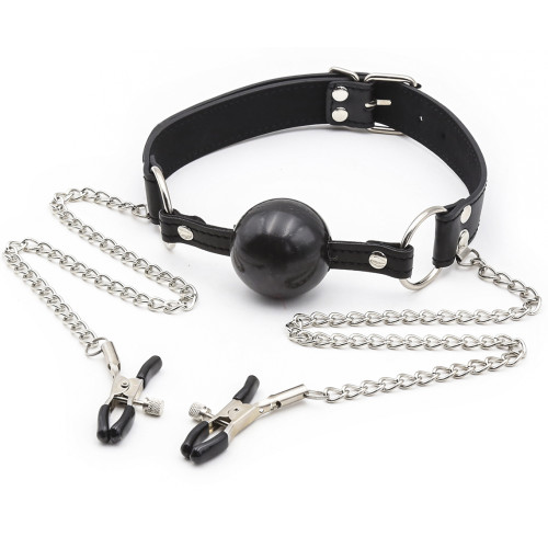 Must-to-have bondage gear accessory by Naughty Toys. A small to medium size Ø 4 cm, tpe black mouth gag with chained adjustable nipple clamps. Yes, you can apply on the nipples, as much pressure as you like. Adjustable PU leather collar. Ideal for both genders.