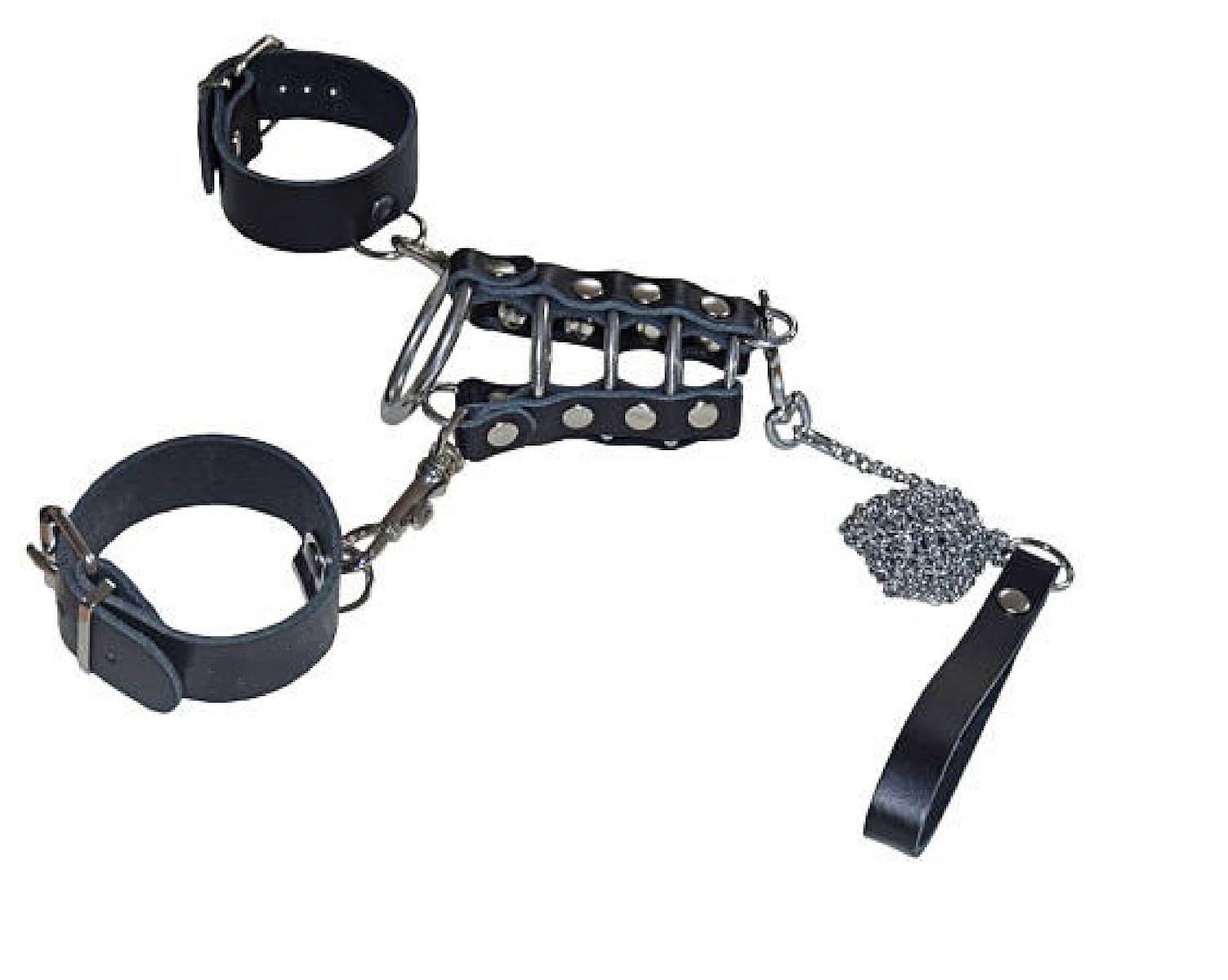 Κατασκευάζετε στην Ελλαδα, χειροποιητο, απο ΓΝΗΣΙΟ δέρμα και υλικά άριστης ποιότητος και αντοχής. Δακτύλιος με κεντρικό μεταλλικό κρίκο διαμέτρου 5εκ για όρχεις-πέος και 4 διαμέτρου 3,5εκ για το πέος. Διαθέτει 2 χειροπέδεςε, δέστρες χεριών που δένονται στα πλάγια του δακτυλίου και λοθυράκι υπακοής με αλυσίδα για να έχετε τον απόλυτο έλεγχο στα ερωτικά παιχνίδια σας.