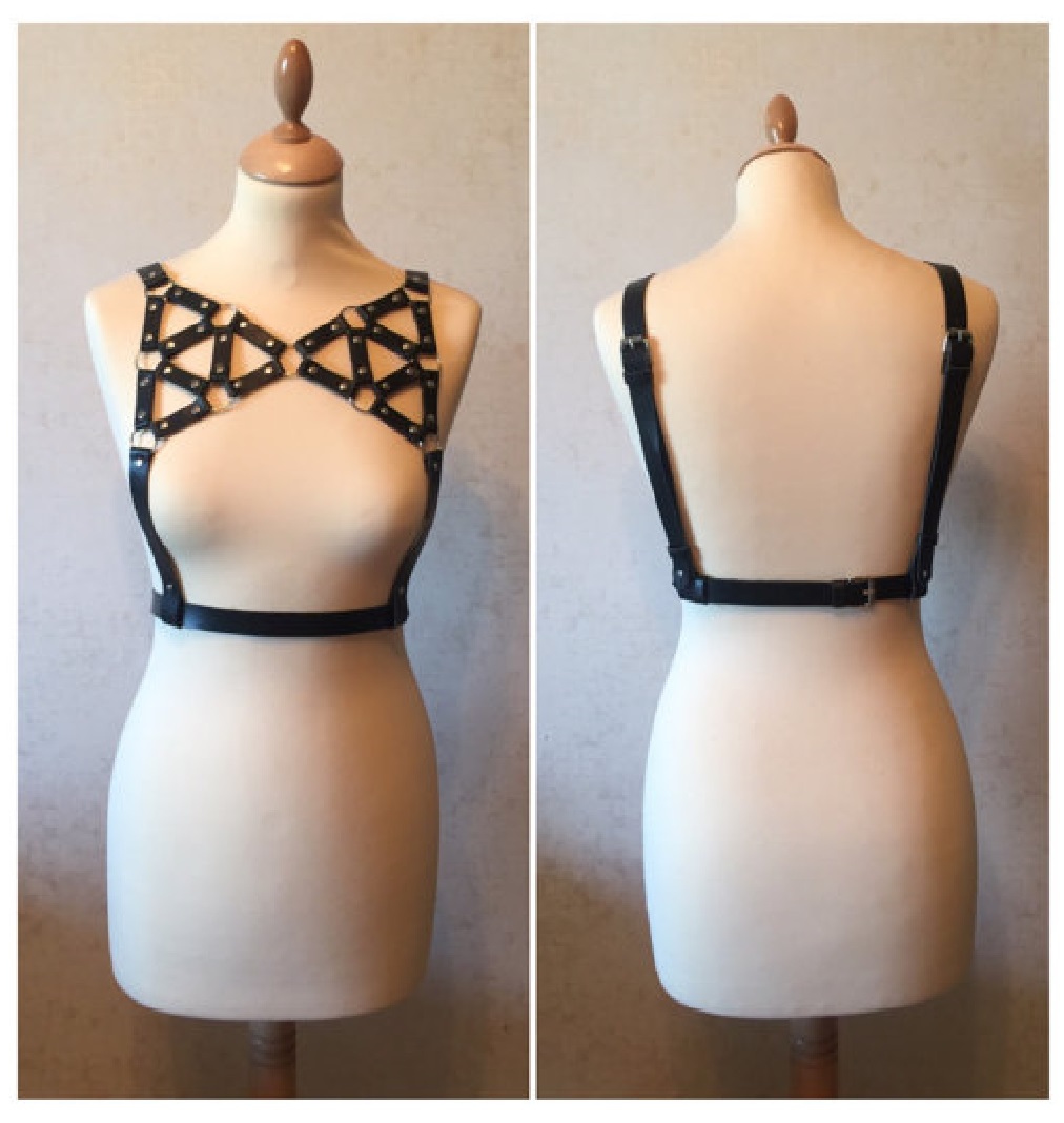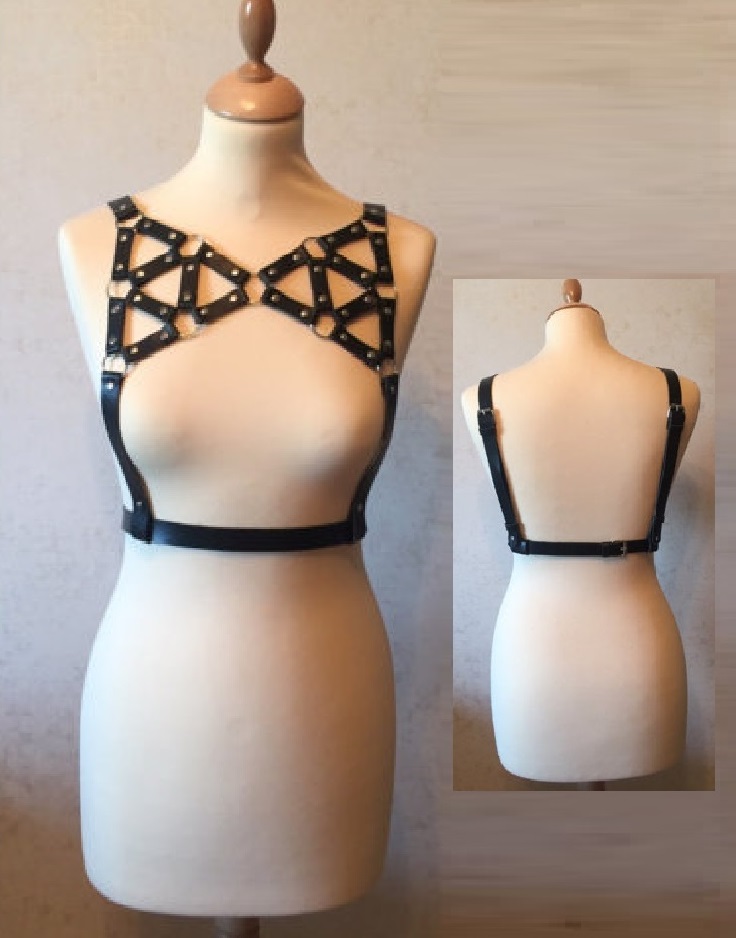 Κατασκευάζετε στην Ελλαδα, χειροποιητο. από ΓΝΗΣΙο δέρμα, και υλικά άριστης ποιότητος και αντοχής. Αξεσουάρ στο στήθος, με 2 τριγωνάκια σε πλέξιμο με λουράκια, και ζώνη με ενώσεις. Ακριβοθόρητο και σπάνιο αξεσουάρ και πάνω από τα ρούχα για φετιχιστική πρωτοτυπία σε μιά εξαιρετική έξοδό σας.Αναβαθμίζει και ανανεώνει το ντύσιμό σας και σας δίνει μιά εξτρά δυναμική αυτοπεποίθηση.