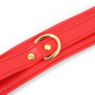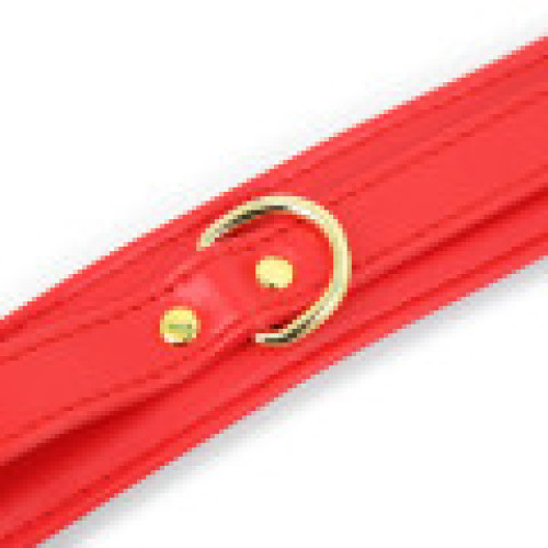 A beautiful pair of sexy red faux leather wrist restraints together with a matching detachable yellow gold snap-hook. One size, fully adjustable to fit on both genders. Made of quality materials to offer strenth while in use by serious SM fetish players. Our slender style red leather cuffs with yellow gold hardware. The pretty yellowish contrasts beautifully with the deep, mystery of our classic leather bondage cuffs. With the strength of leather, 2cm width and quality hardware, these BDSM restraints will keep a tight and snug fit while offering flexibility around the ankles.