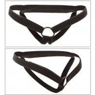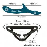 Strap-on harness: straps 2.5 cm wide, hip circumference max. 111 cm (adjustable), circumference of each leg max. 40 cm. Polyester, latex, nylon, metal.