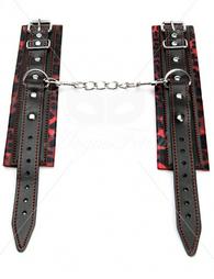 Οι κλασικές κόκκινες μανσέτες καρπού με λεοπάρ είναι κατασκευασμένες από δέρμα και εξαρτήματα χωρίς νικέλιο. Είναι άοσμα, πολύ ανθεκτικά για όλα τα είδη κρεβατιών. Η σύνδεση μεταξύ τους γίνεται μέσω δύο συνδετικούς κρίκους τα οποία μπορούν να αποσπαστούν και να συνδεθούν μεταξύ τους ή με κάτι χρησιμοποιώντας ένα σχοινί. Τα άκρα είναι ραμμένα με κόκκινη κλωστή, χάρη στην οποία θα είναι πολύ ανθεκτικά.