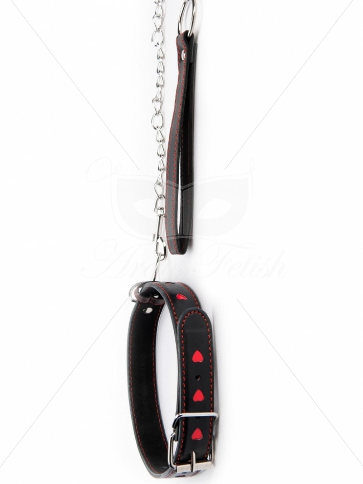 Ο πλήρως ρυθμιζόμενο μαύρο περιλαίμιο με αποσπώμενο λουρί κατασκευασμένο από συνθετικό δέρμα και μέταλλο χωρίς νικέλιο. Είναι διακοσμημένο με κόκκινες καρδιές και μπορεί να κλείσει με μεταλλική πόρπη, η οποία χρησιμοποιείται επίσης για τη ρύθμιση του πλάτους. Το μοντέλο είναι unisex ώστε και τα δύο μέρη να μπορούν να απολαμβάνουν ενώ παίζουν.